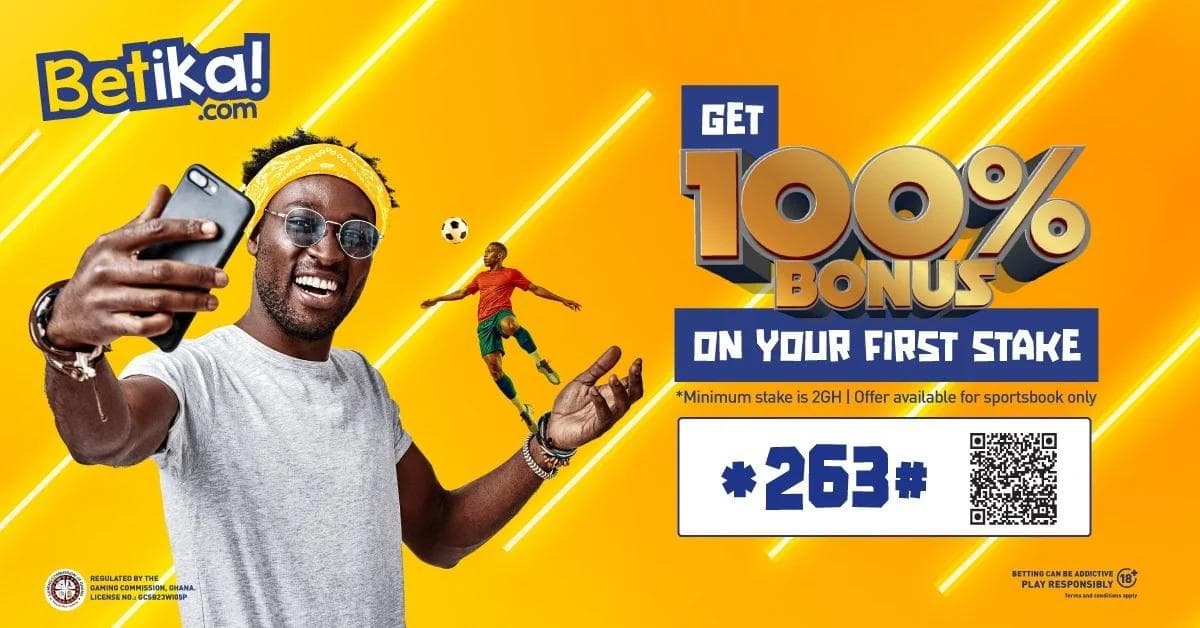New Betika customers (USSD or mobile/web) can receive a 100% Stake Back Free Bet, up to GHC 50, after placing their first qualifying sportsbook bet. The offer applies only to first-time registrations.
