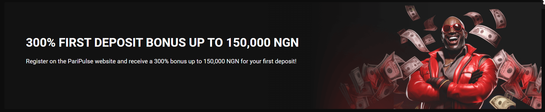 PariPulse Nigeria offers a 300% first deposit bonus up to 150,000 NGN for new users.